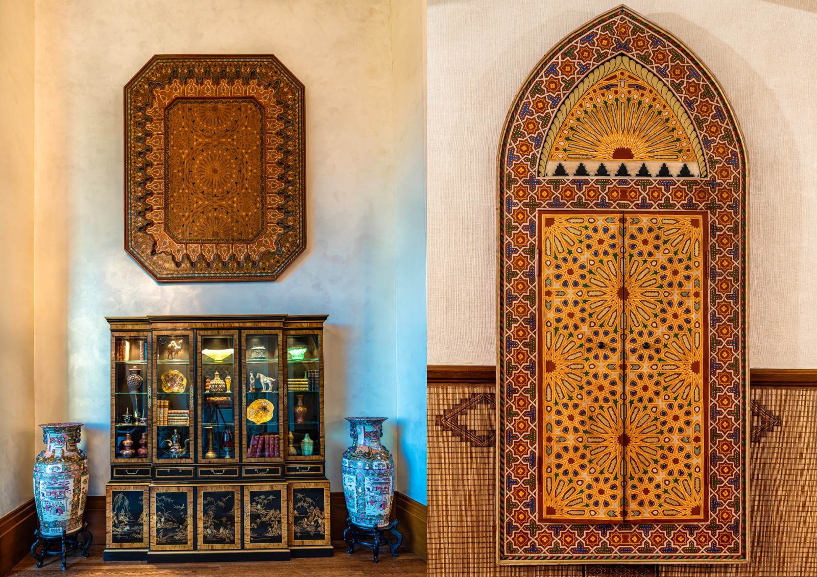 Delve into Moresque's Wood Wall Panels Gallery, where traditional Moroccan craftsmanship meets contemporary design elegance. Our specialized collection features Architectural Wood Wall Panels, in addition to Doors, Ceilings, Arches, and Windows, all crafted from premium woods such as Moroccan Cedar and African Mahogany. These wall panels are adorned with intricate Naksh carving and Zwak painting, showcasing the rich Moroccan-Andalusian heritage through elaborate Floral, Geometry, Muqarnas, and Calligraphy motifs. Handcrafted with precision in our Fez workshops, our wood wall panels are a testament to authenticity and detailed artistry. Catering to a global market, Moresque offers bespoke wood wall panels that provide quality, sophistication, and a touch of timeless beauty, ideal for transforming any interior space.